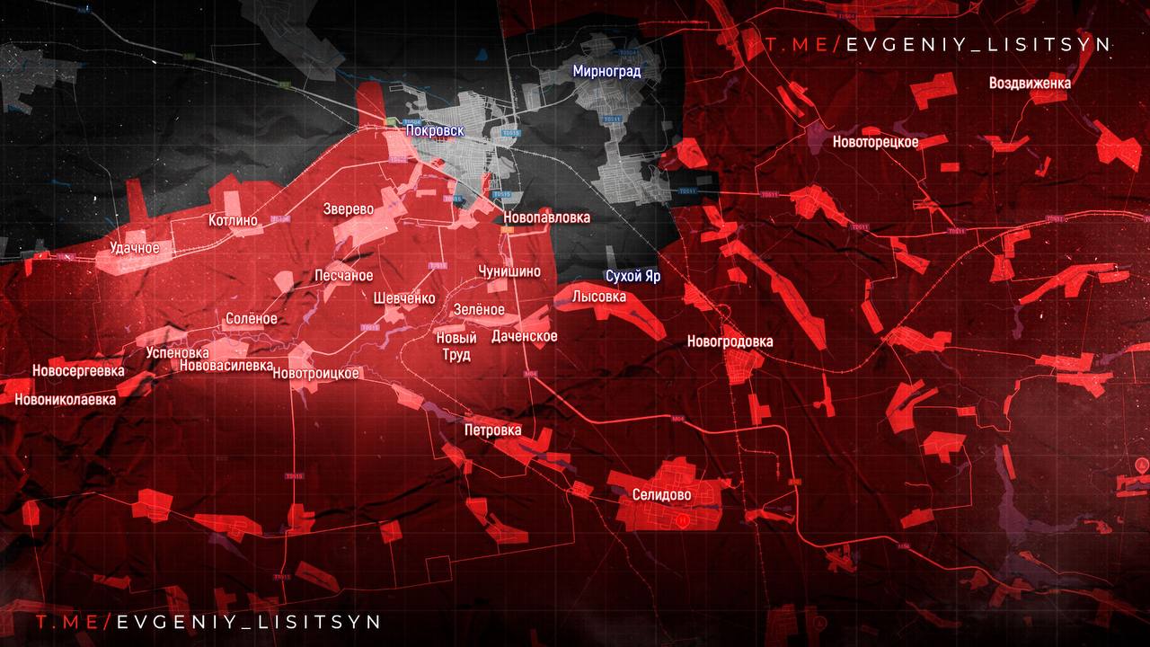 На Покровском фронте наши наступают вдоль ж/д к Гришино, бои в центре Покровска и на окраинах Мирнограда. Освобождено Чунишино, под контролем участок трассы до Новопавловки. Есть продвижение в Родинском и районе Нового Донбасса.