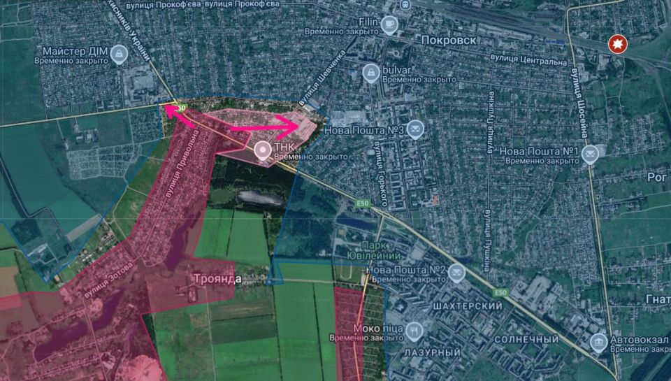 Отметим, что трасса Е50 связывает Красноармейск с Павлоградом и оставалось одной из двух последних дорог, по которой снабжалась оккупационная группировка ВСУ.