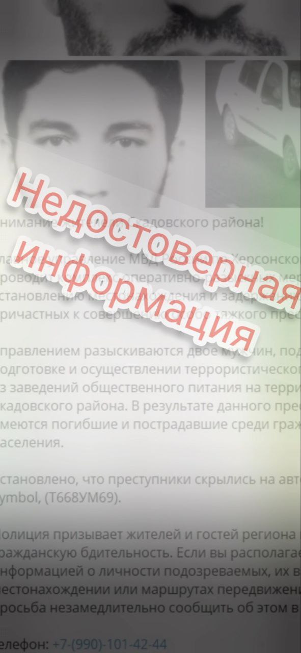 «Главное управление МВД России по Херсонской области сообщает, что в мессенджере Телеграм злоумышленниками создана цифровая копия содержимого экрана (скриншот), повторяющая название официального канала херсонской полиции.В частности, сообщается, что Главное управление МВД России по Херсонской области распространило информацию о якобы розыске двоих подозреваемых, причастных ко взрыву в кафе в поселке Хорлы Херсонской области, скрывшихся на легковом автомобиле.