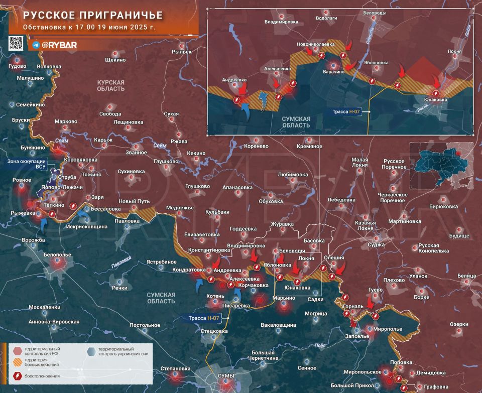 На Сумском направлении российские войска продавили оборону противника в Юнаковке, завязав бои на северных окраинах населенного пункта. В то же время противник провел несколько неудачных контратак на рубеже Андреевка — Алексеевка.