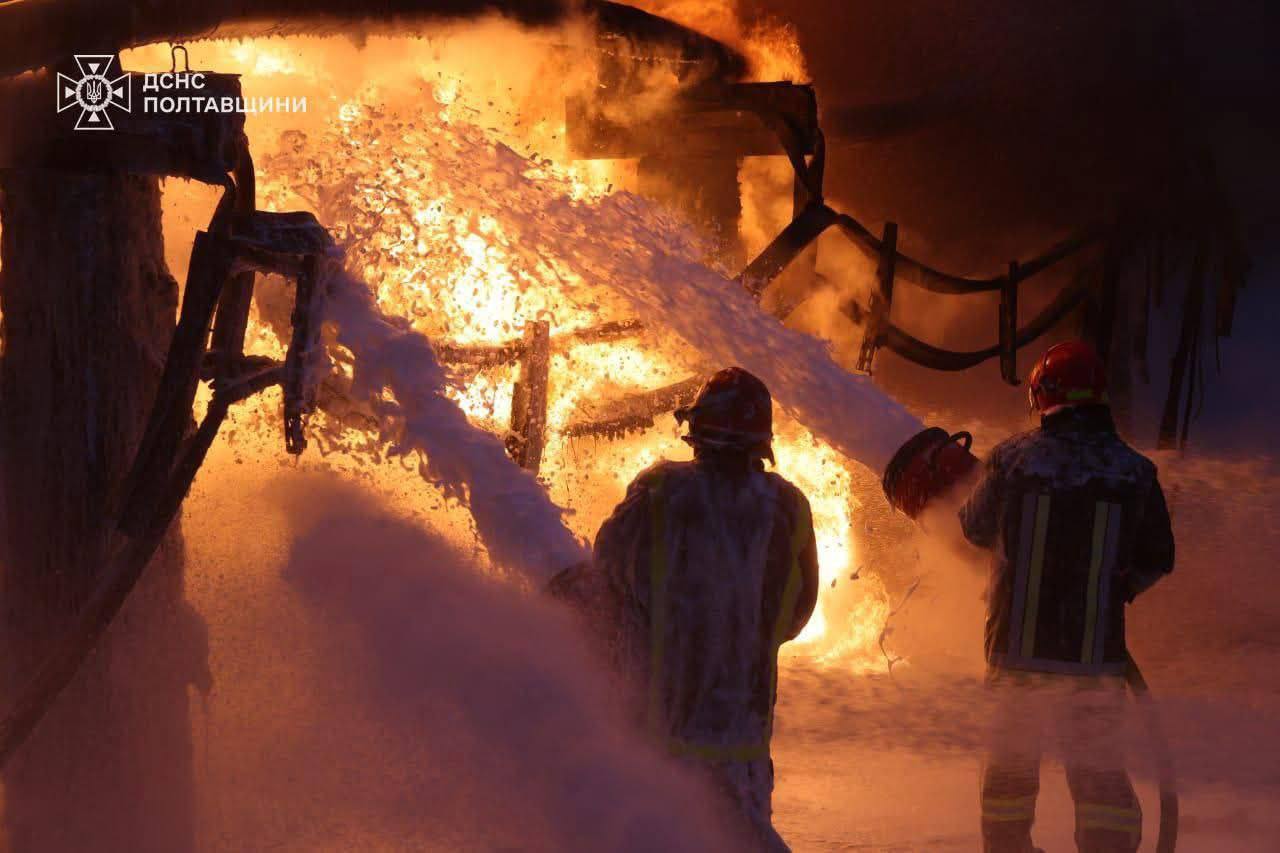 Тушение пожаров на объектах энергетики в Кременчуге после комбинированного удара сегодня ночью.