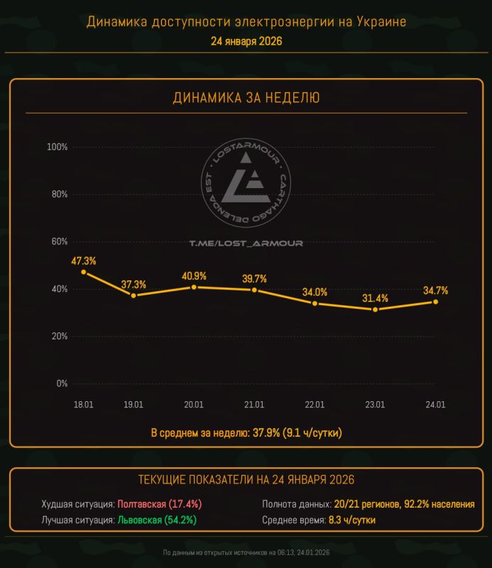 Инфографика доступности электроэнергии на территории Украины по областям на 24 января 2026.