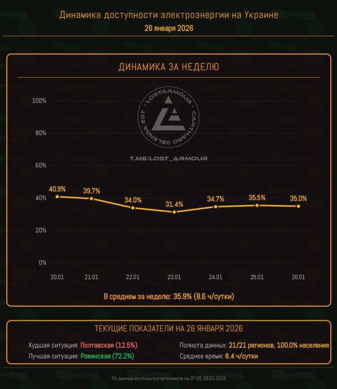 Инфографика доступности электроэнергии на территории Украины по областям на 26 января 2026.