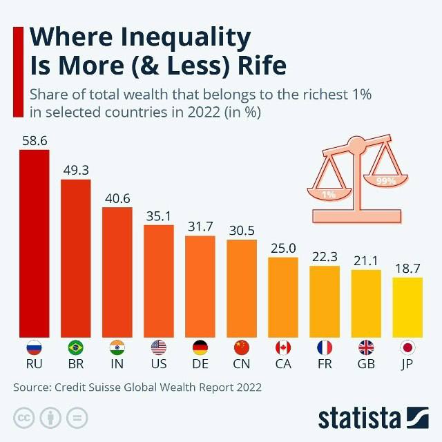 Для сравнения, в 2022 году, по данным Credit Suisse, 1% богатейших россиян владел 58,6% национального богатства (на скрине) — уже тогда это был рекорд среди крупных экономик мира.