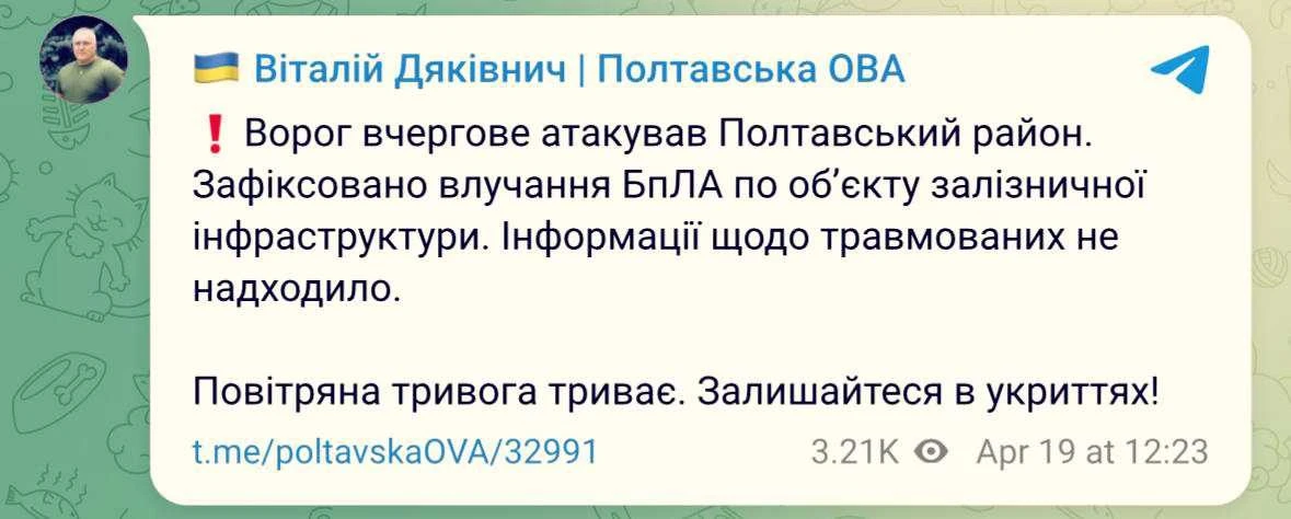 О прилете БпЛА по железнодорожной инфраструктуре в Полтавском районе сообщает местная администрация
