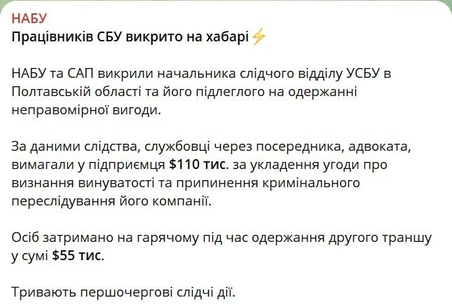 Национальное антикоррупционное бюро Украины (НАБУ) сообщило, что был задержан начальник следственного отдела управления СБУ по Полтавской области. Также арестован и его подчинённый. Они через посредника-адвоката требовали от предпринимателя 110 тыс. гривен (~187 тыс. рублей) за прекращение уголовного дела.